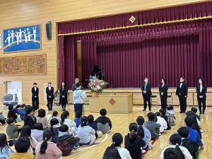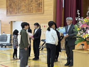 離任式 3月26日 2026年03月26日 本日は離任式が行われ、本校からは10名の職員が転退職されることとなりました。子どもたちも親しんだ先生方との別れを惜しみ,思い出話をしたり、お手紙を渡したりしていました。異動される先生方もお体にお気を付けて,頑張っていただきたいと思います。 学校からのお知らせ