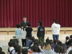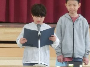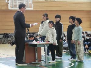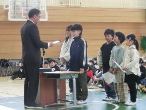 1年間の課程を修了した証として,各学級の代表に校長先生から修了証書が手渡されました。1年生と5年生の児童が3学期のふり返りと来年度へ向けての抱負を発表しました。