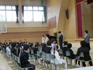 来賓の皆様やたくさんの保護者の皆様、6年生のお兄さん、お姉さんたちに見守られ、担任の先生方の呼名に大きな声で返事をしました。新入生の、名前を呼ばれると「はい」と大きな声で返事をする姿に、会場は温かな空気に包まれました。